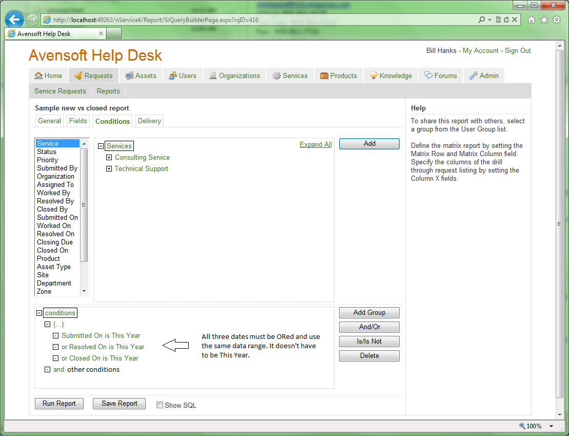 Go to Requests, Report, click the New Matrix or Chart Report from the Advanced Reports section. Select "New Vs Closed" from the matrix column drop down, set the date interval. Then go to the Conditions tab and add the three dates conditions. See screen shot below.