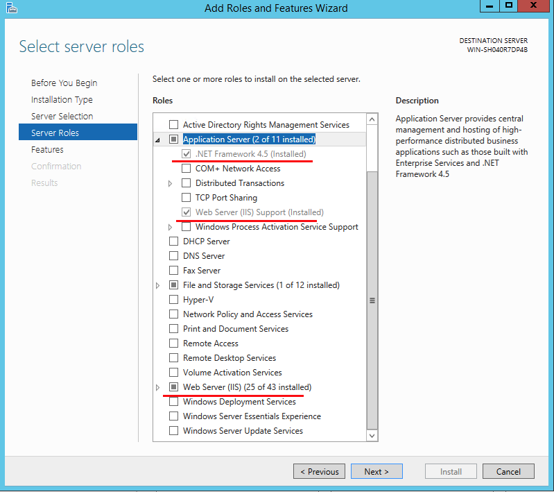 If IIS is not enabled on the new server, enable it and the Application Server through Control Panel, Turn Windows Features On/Off (see screenshot below)