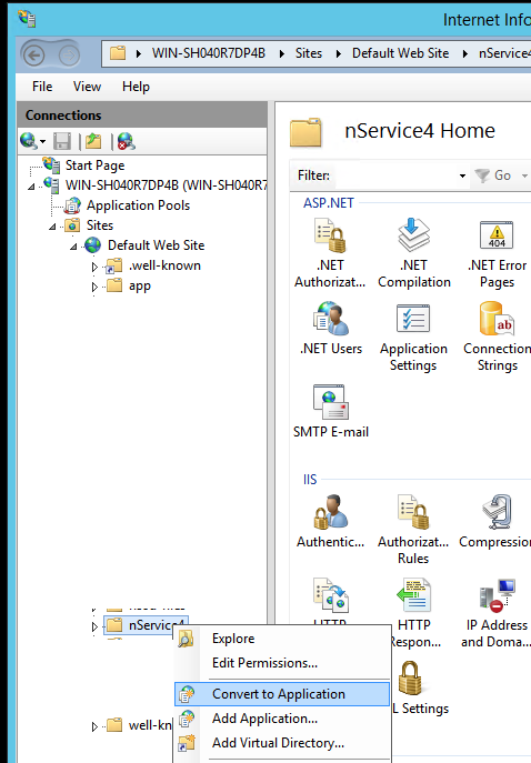 Right click nService4 on the left pane and select Convert to Application command (see screenshots below)